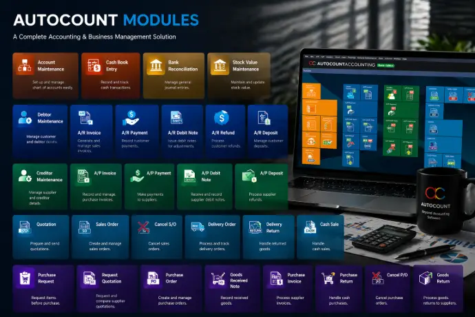 An AutoCount Module is a feature add-on designed to extend the functionality of your AutoCount Accounting System. Instead of a one-size-fits-all platform, AutoCount uses a modular approach allowing you to add only the tools your business truly needs.