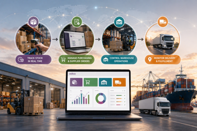 With Odoo, your business can manage the full supply chain process in one integrated platform — from purchasing and inventory control to warehouse operations, delivery tracking, and invoicing.